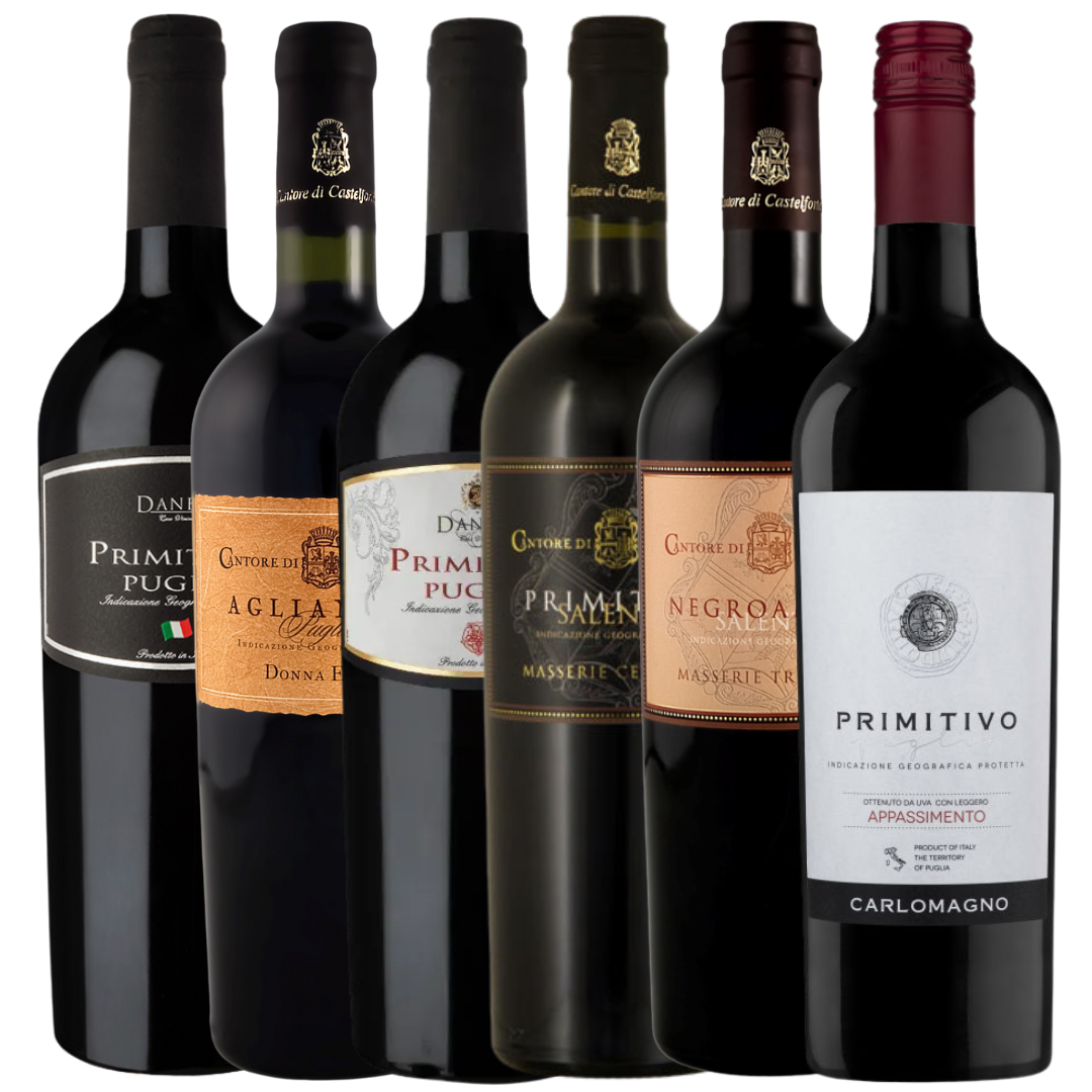 Základem balíčku jsou 4 Primitiva – dvě vína základní řady, která jsou skvělá pro každodenní pití, dále jedno výrazné Primitivo Appassimento s plnější strukturou a koncentrovanou chutí a Primitivo Salento I.G.T. Masserie Centoze Cantore di Castelforte, které patří mezi opravdu vynikající vína regionu a zaujme svou elegancí a hloubkou. Kolekci doplňuje Negroamaro, typická odrůda Puglie s kořenitým projevem, a Aglianico, historická odrůda známá svou strukturou a charakterem.